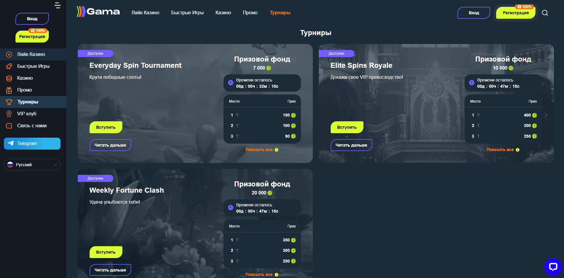 При этом опытным игрокам тоже есть чем заняться. Gama Casino держит широкий выбор live-игр с реальными дилерами, покерные варианты и турниры с призовыми фондами. Здесь нет ощущения, что тебя загоняют в один угол — выбирай формат под настроение.
